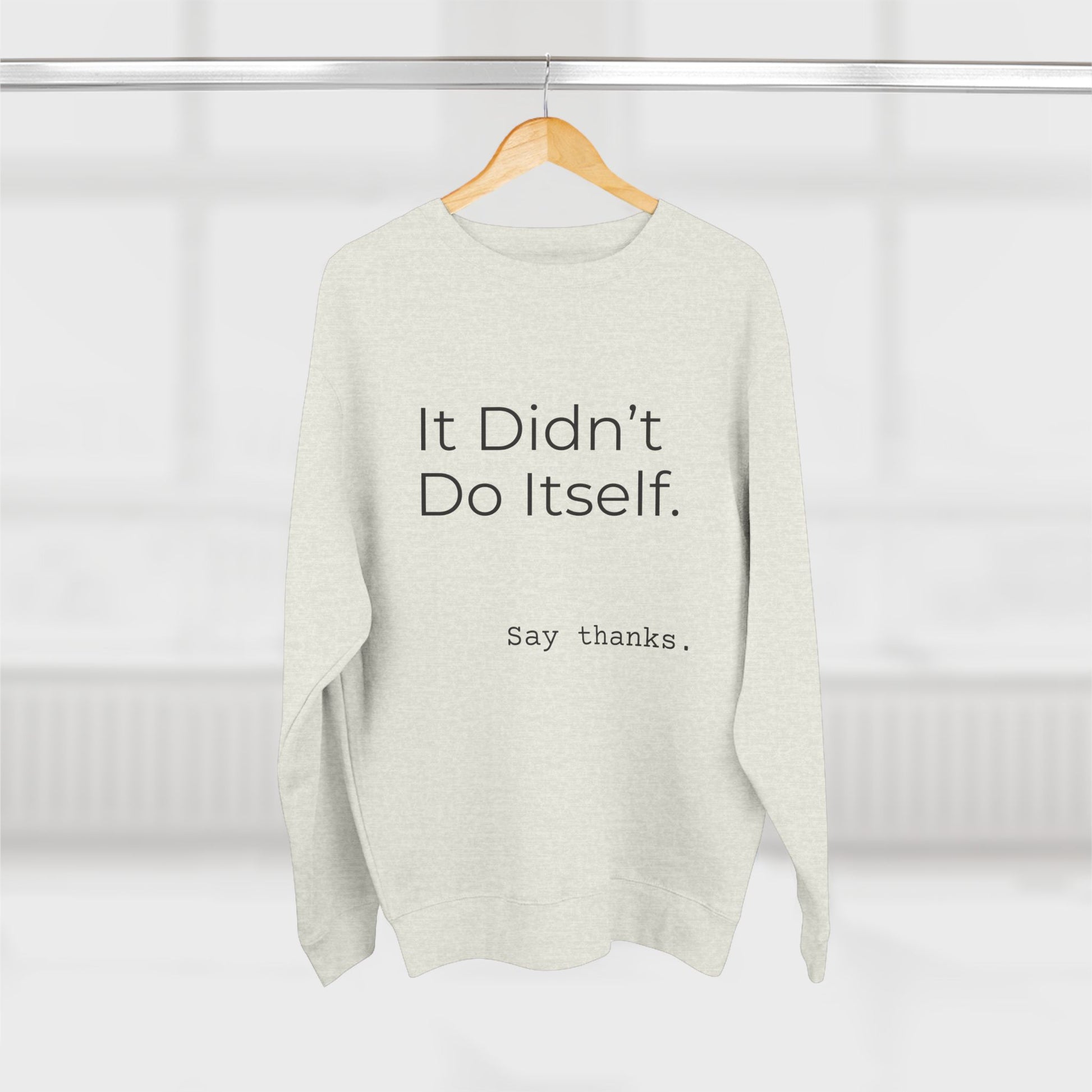 Elevate your casual style with this Unisex Crewneck Sweatshirt, perfect for adding a touch of comfort and personality to your everyday outfits. Its versatile design makes it ideal for both men and women, making it a great addition to any wardrobe. Feel cozy and confident while showcasing your sense of humor with the cheeky phrase, "It Didn't Do Itself. Say thanks." This sweatshirt is perfect for relaxed weekends, casual outings, and even as a thoughtful gift for loved ones. Whether you're celebrating holidays, enjoying family gatherings, or just lounging at home, this sweatshirt will keep you feeling snug and stylish. Targeted at those who appreciate witty fashion, it's a fun choice for anyone who loves to express themselves while staying comfortable.